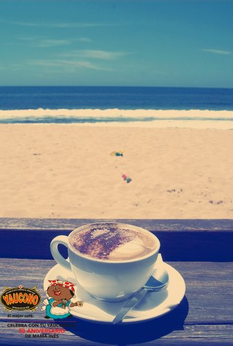 Enjoy a delicious cup of coffee from Cafe Yaucono as you watch the waves roll up on shore